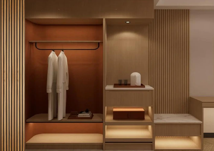 - Wood veneer panels → WPC wall panels → wooden acoustic panels → hotel and office interior solutions